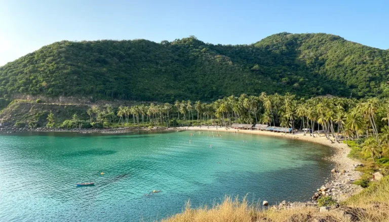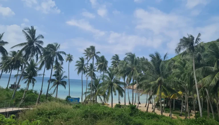 You will find Bãi Cây Mến nestled on the back side of Hòn Lớn (Big Island), also known as Hòn Củ Tron, the largest island in the Nam Du group. The beach’s name, Cây Mến, refers to the abundance of Mến trees (similar to coconut palms) that line the shore, providing ample shade and a picturesque backdrop.