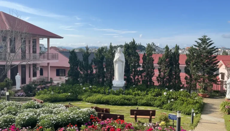 The Domaine de Marie Church (Nhà Thờ Domaine de Marie) is one of Da Lat’s most iconic and aesthetically distinct landmarks. Located atop a scenic hill just outside the city center, this Catholic complex immediately captures the eye with its vibrant, salmon-pink exterior and unique architectural blend. The church is part of a functioning nunnery and convent, which actively operates a kindergarten and supports local community work.