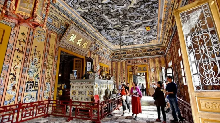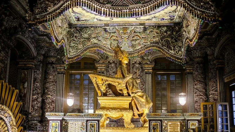 Thien Dinh Palace: This final, main structure holds the Emperor’s physical remains. It contrasts sharply with the exterior; its five connecting rooms dazzle with vibrant color, featuring intricate mosaics crafted from broken porcelain and colored glass. The main chamber contains a gilded bronze statue of Emperor Khai Dinh sitting on a golden throne, underneath which his body rests 18 meters below.