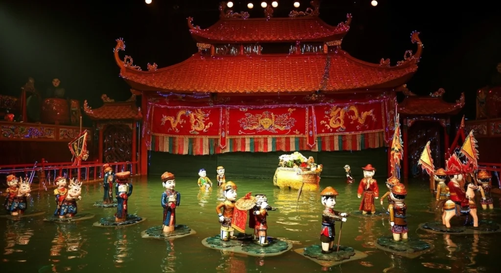 The Illusion: The stage is a chest-high pool of water, which brilliantly serves as the surface for lakes, rivers, and village ponds. Puppeteers, hidden behind a decorative screen, stand waist-deep in the water and skillfully control the wooden puppets using long rods and complex underwater mechanisms. This masterful technique creates the illusion that the puppets are moving freely on their own, a captivating visual trick.