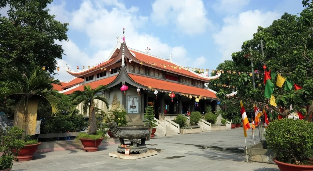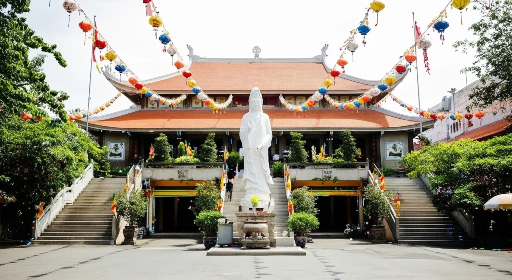 The Fusion of Styles: The temple’s expansive, two-story main hall features overlapping curved roofs adorned with intricate dragon and phoenix motifs—a classic element of Vietnamese architecture. This grand scale provides a sense of majesty and a peaceful refuge from the ceaseless energy of Saigon.
