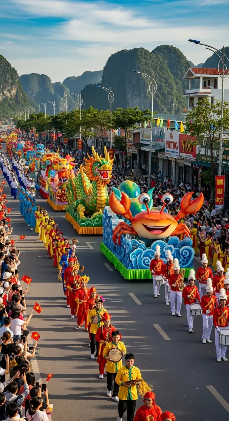 The Heart of the Carnival: The street parade is the most anticipated part of the festival, featuring a lively procession of ornate floats (often depicting iconic symbols of Hạ Long Bay like dragons and fishing boats) and performers.