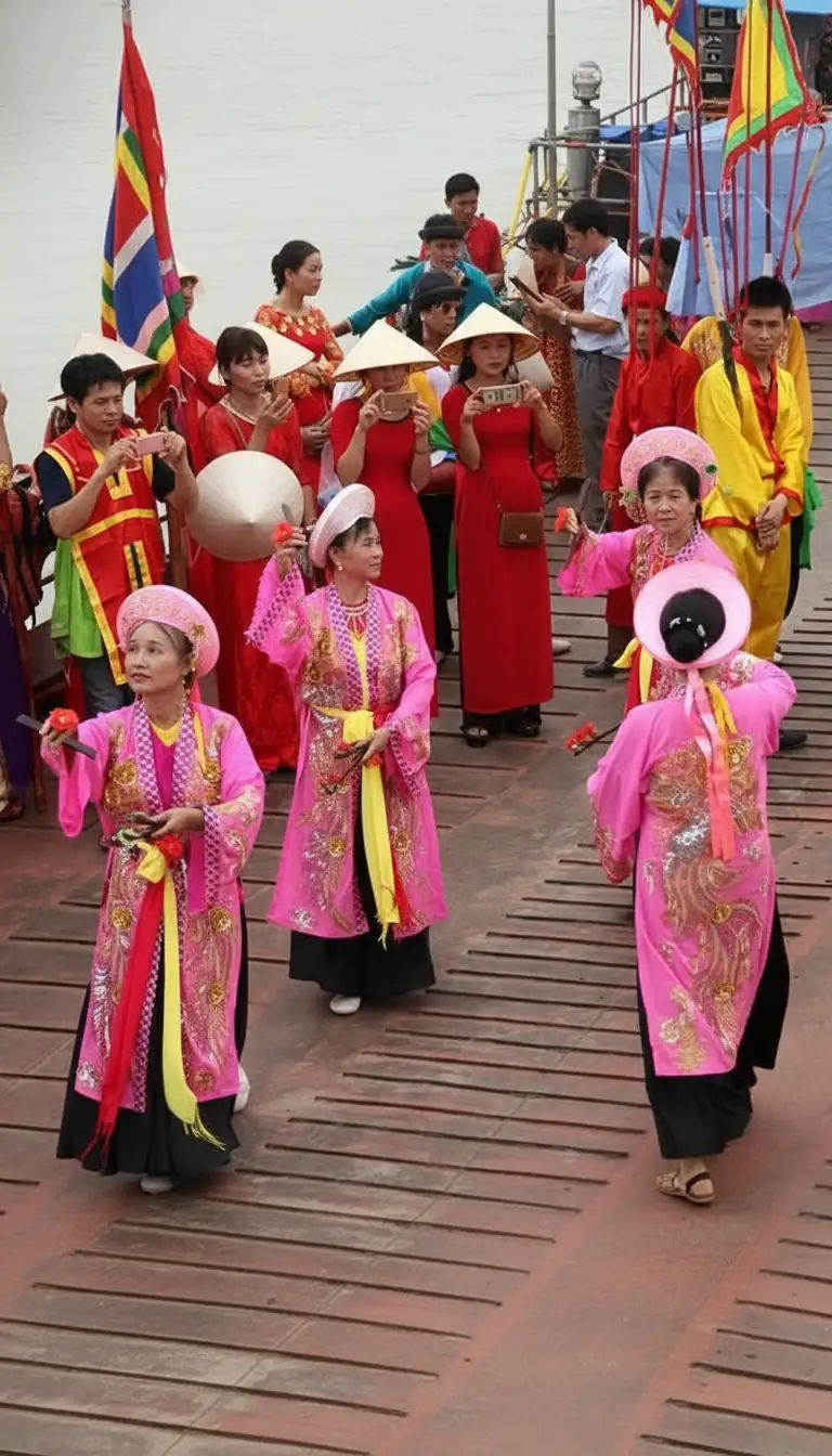 Gathering the Water: At the riverbank, a highly ceremonial boat is used to collect sacred water from the Red River, symbolizing the purity of the land and the lifeblood of the delta. This water is then processed back to the temple to be used in worship and purification rituals.