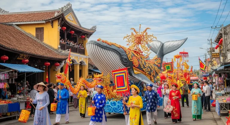 The Nghinh Ông Festival, also known as the Whale Worshipping Festival, is one of the most significant and colorful traditional events for Vietnam’s coastal communities. It is a heartfelt tribute to Cá Ông (Lord Fish)—the Whale God—who is revered as a benevolent deity believed to save fishermen from storms and shipwrecks at sea.