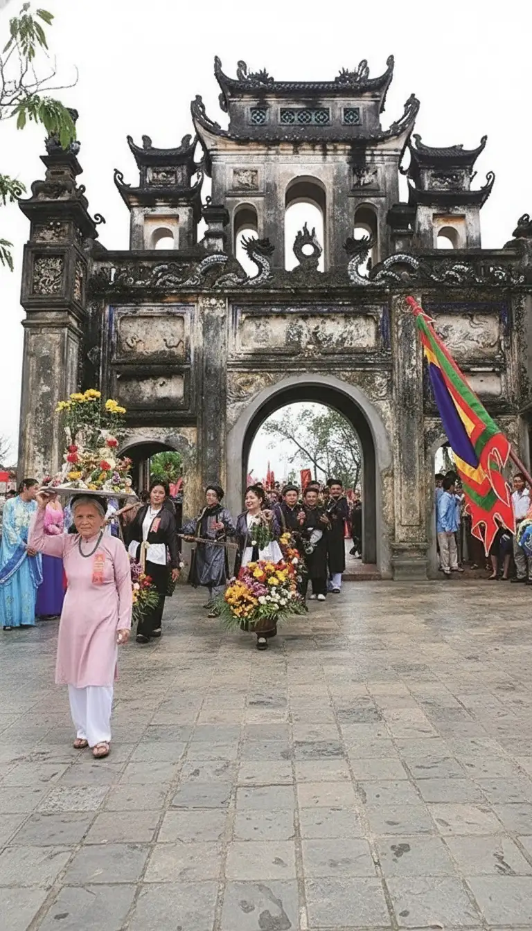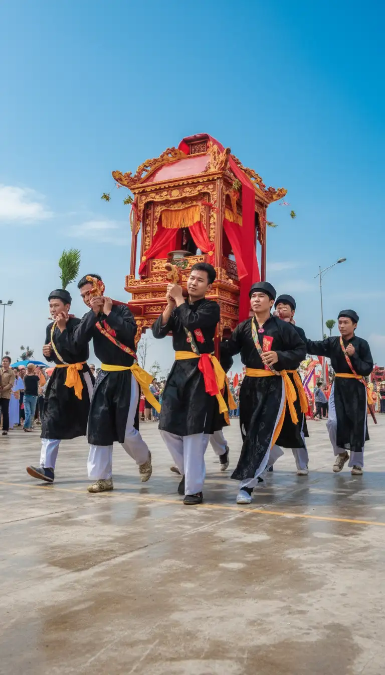 Fish Offering (Đả Ngư): Thirteen young men, representing the 13 settlements founded by the hero, perform the ritual of catching a large carp from the village well. This fish is placed on a tray, covered with a red cloth, and presented as an offering to the tutelary god.