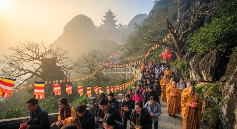 Lễ hội Yên Tử is one of Vietnam’s most profound and sacred spiritual events. It centers around a pilgrimage to Yên Tử Mountain, the hallowed site where the revered King-Monk Trần Nhân Tông abdicated his throne in the 13th century to devote his life to Buddhism. He founded the Trúc Lâm Zen (Bamboo Forest Zen) tradition, the first distinctively Vietnamese school of Buddhism.