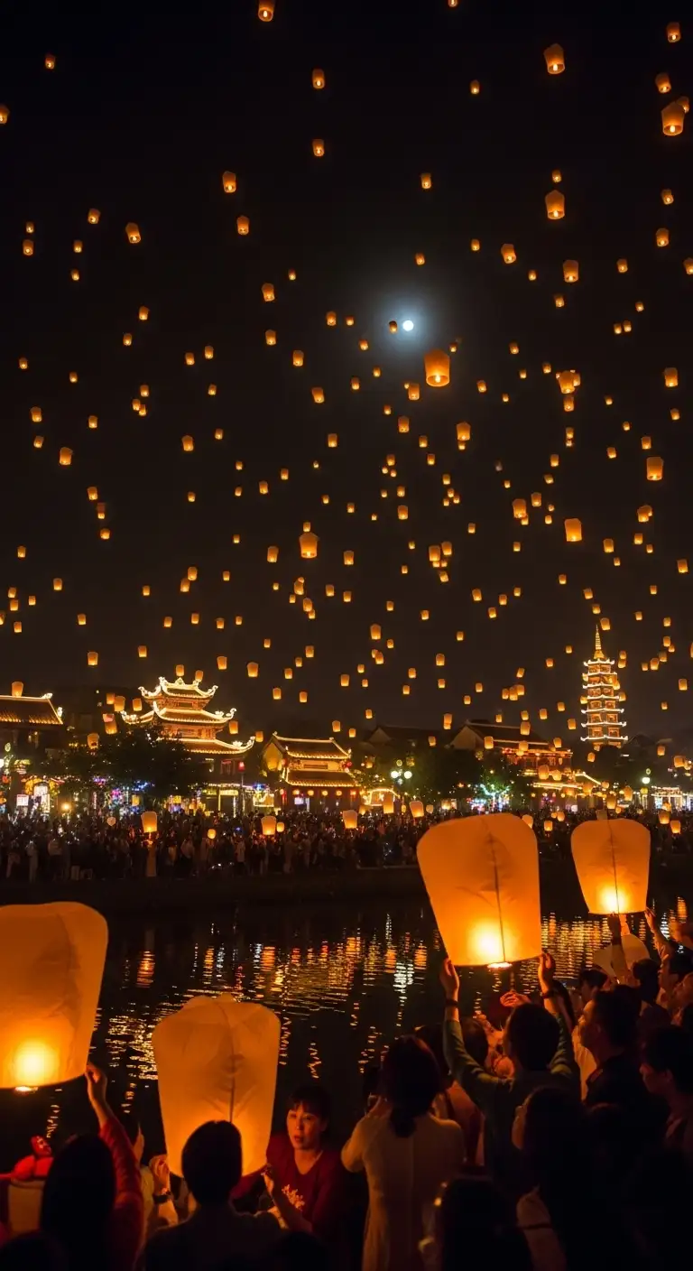 Lighting the Way: Small, colorful paper lanterns are lit and released onto the water, representing prayers for ancestors and symbolically lighting the way for wandering spirits to find their path to nirvana or rebirth.