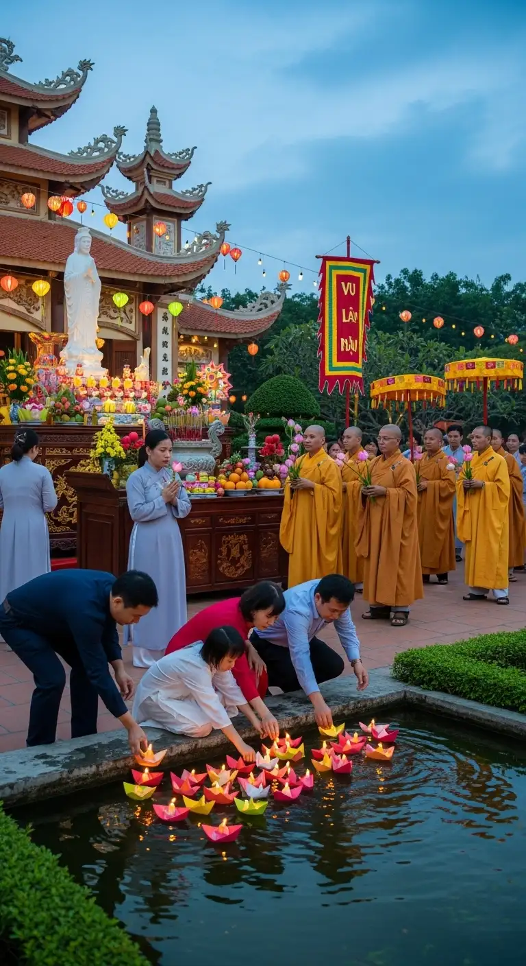 The festival’s origin is tied to the Buddhist tale of the Bodhisattva Mục Kiền Liên. According to the legend, he used his spiritual powers to see his deceased mother suffering as a hungry ghost. He sought the Buddha’s advice, who instructed him to gather monks and perform a great offering on the 15th day of the 7th lunar month. Through these virtuous acts, his mother was released from her suffering, providing the foundation for the tradition of making merit for ancestors.