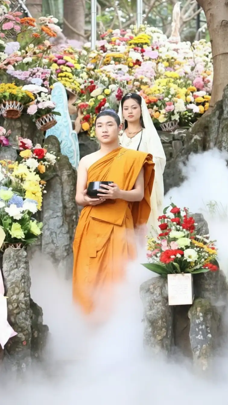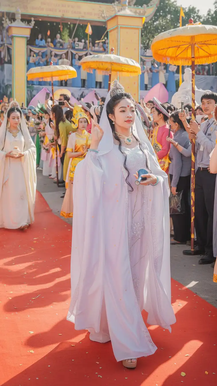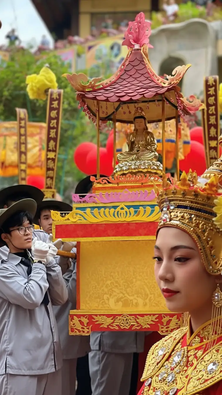 • Statue Procession: A sacred statue of the Bodhisattva, often standing on a lotus throne, is carried in a solemn procession around the temple grounds or even on a boat along the nearby Cổ Cò River, symbolizing the spread of mercy.