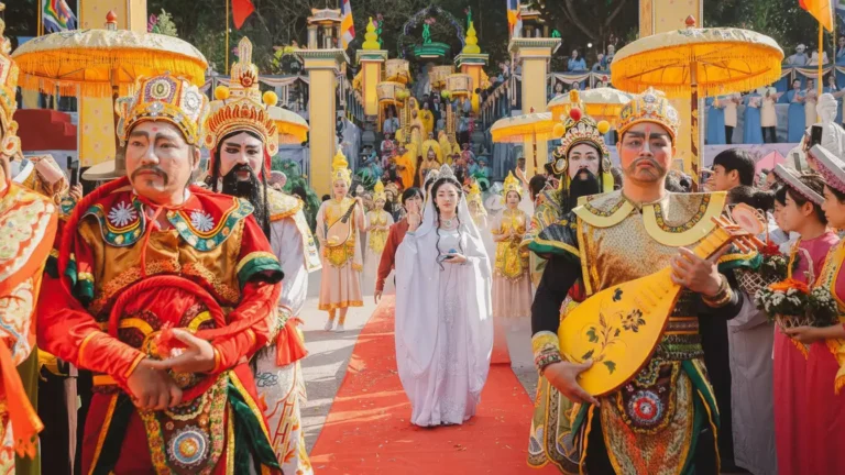 • Procession of Light (Đăng Lễ): A spectacular torch relay and palanquin procession held on the evening of the 18th. The light symbolizes the Buddha’s wisdom guiding all living beings toward enlightenment.