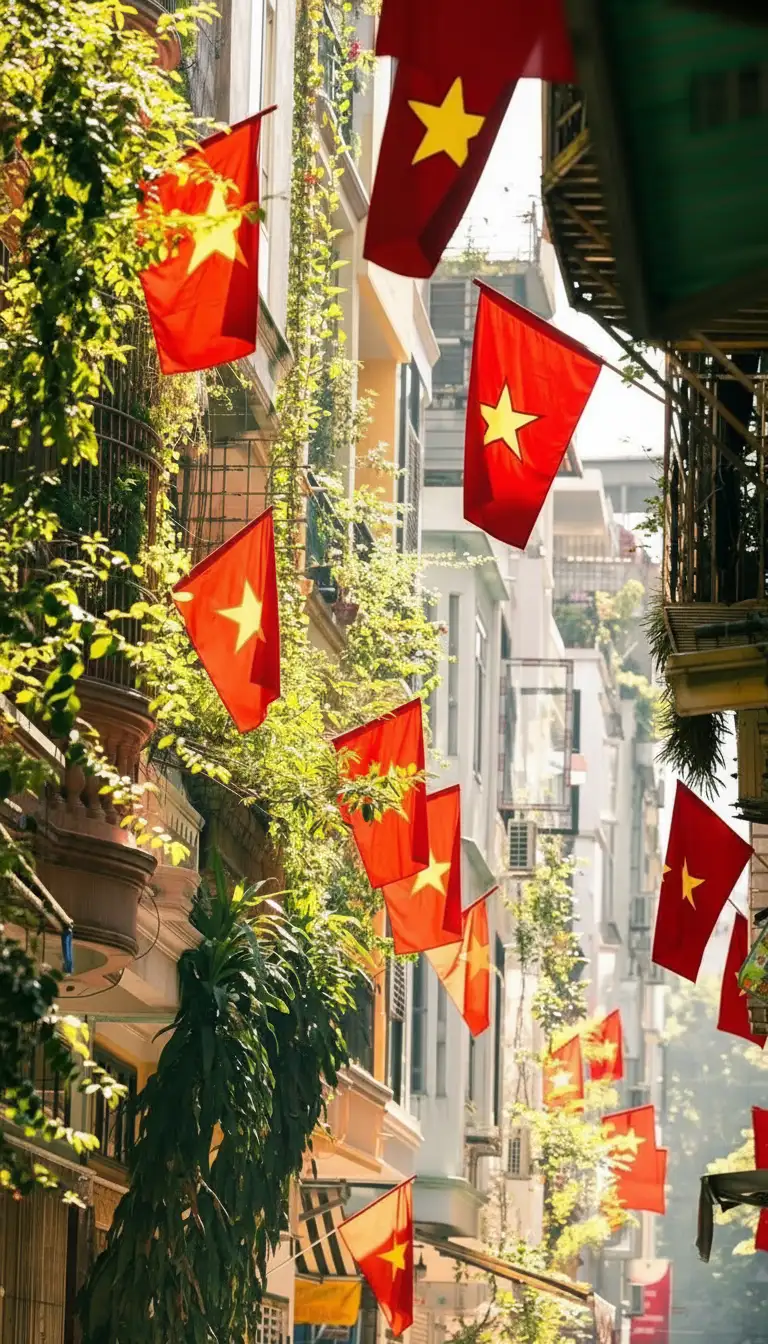 Flag Displays: The Vietnamese flag (red field with a gold star) is prominently flown in front of almost every home, business, and on all street corners. City streets are draped with red and yellow banners and patriotic posters.