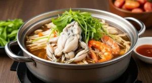 Seafood Hotpot is a flavorful Vietnamese dish combining shrimp, squid, fish, and clams in a rich, ta..