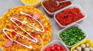 This is a Vietnamese-style pizza made by grilling a thin rice paper base and topping it with ingredi..