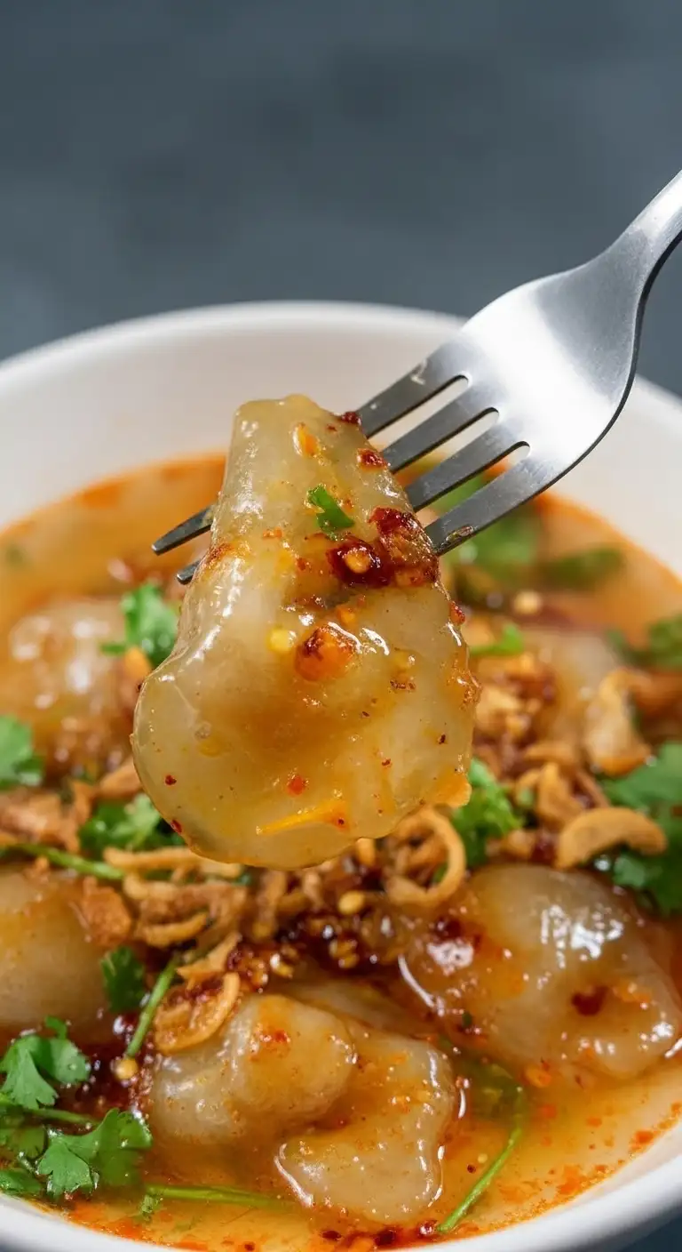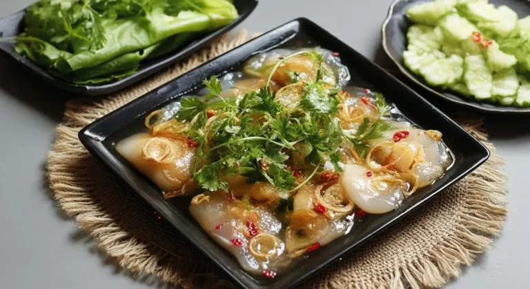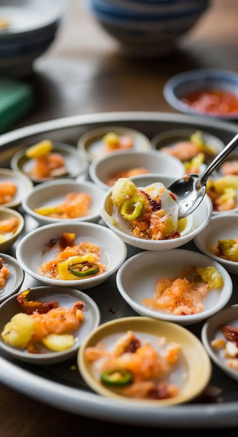 | Central (Miền Trung) | The Origin and Heartland (especially Huế). The dish is refined, meticulously presented, and is the thinnest and most delicate form. | The savory dipping sauce is famously spicy and salty/umami-rich, reflecting the bold, intense flavors of Huế royal cuisine. Toppings include dried shrimp floss, scallion oil, and often crispy pork skin. Regional Central variations (like in Quảng Nam) feature a thicker cake. |