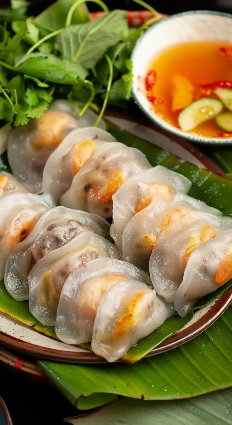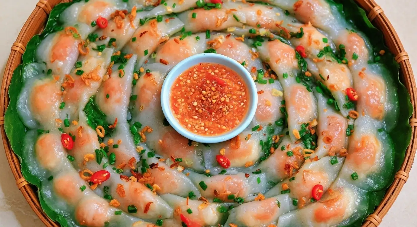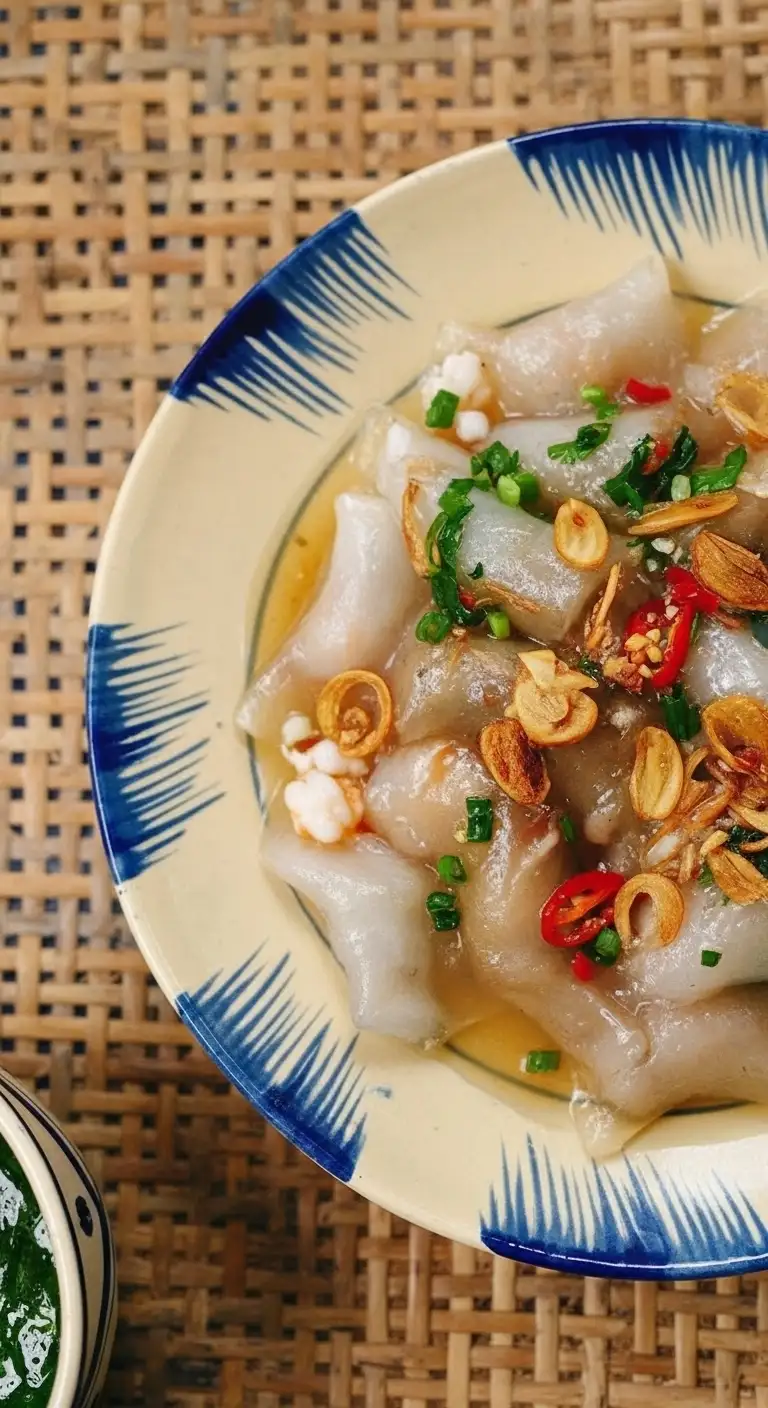 Accompaniments: Bánh Lọc is always served hot and is garnished with fried shallots (hành phi) and a drizzle of scallion oil (mỡ hành) for aroma and richness.