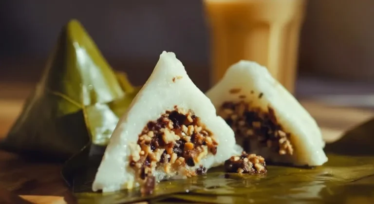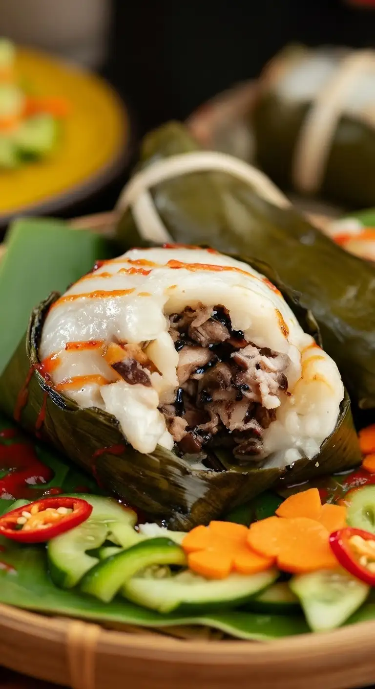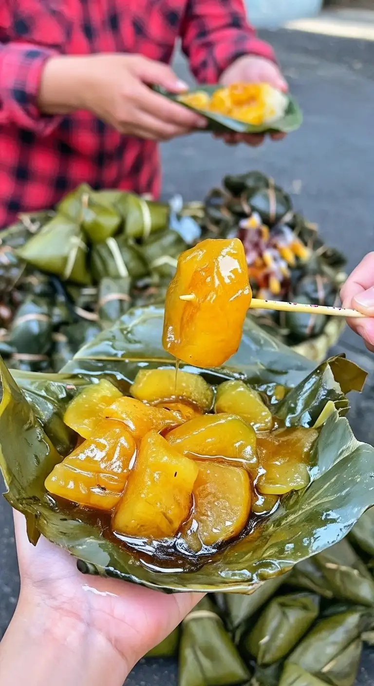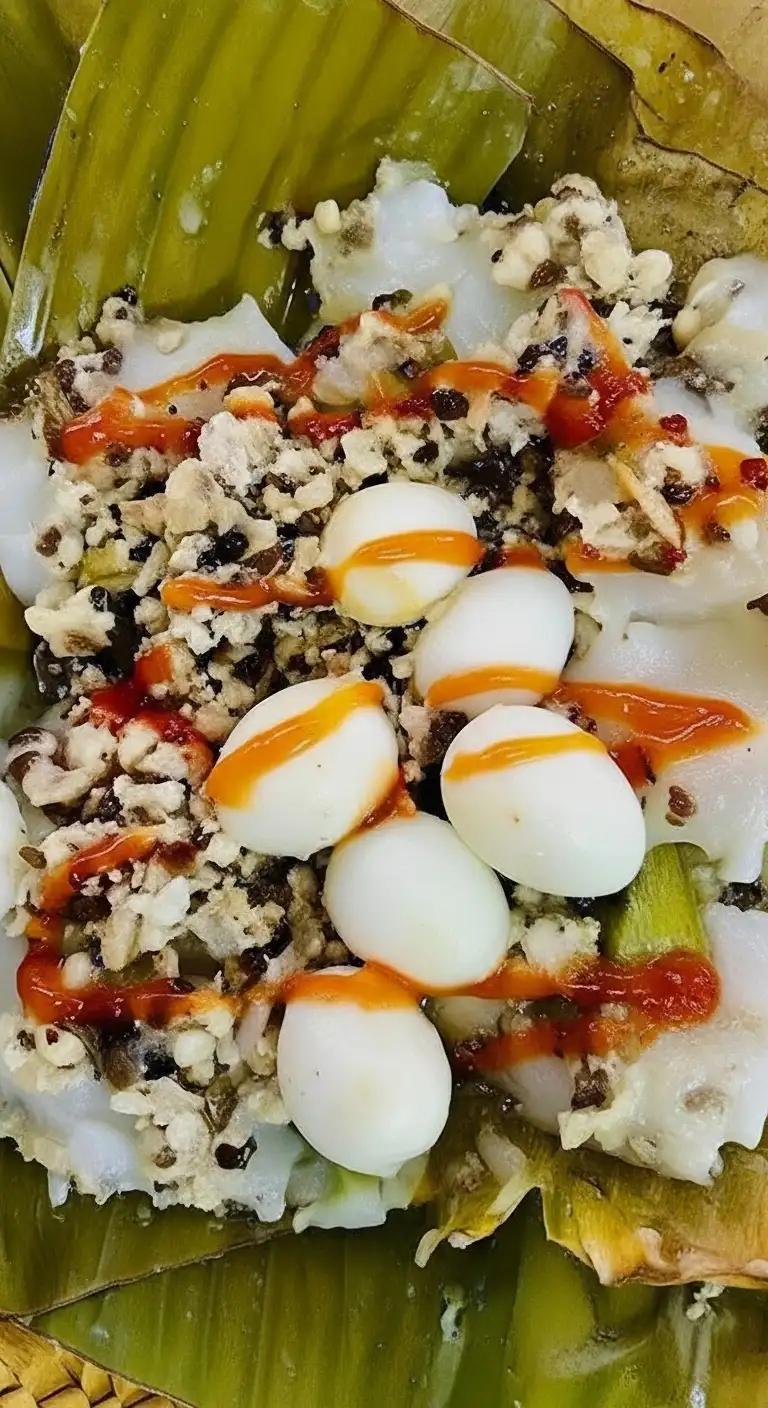 The Preparation: The pork filling is placed in the center of the pre-cooked rice paste, and the whole assembly is meticulously wrapped in banana leaves to form a neat, pyramid or cone shape. It is then steamed until perfectly cooked, allowing the banana leaves to infuse the cake with a subtle, grassy aroma.