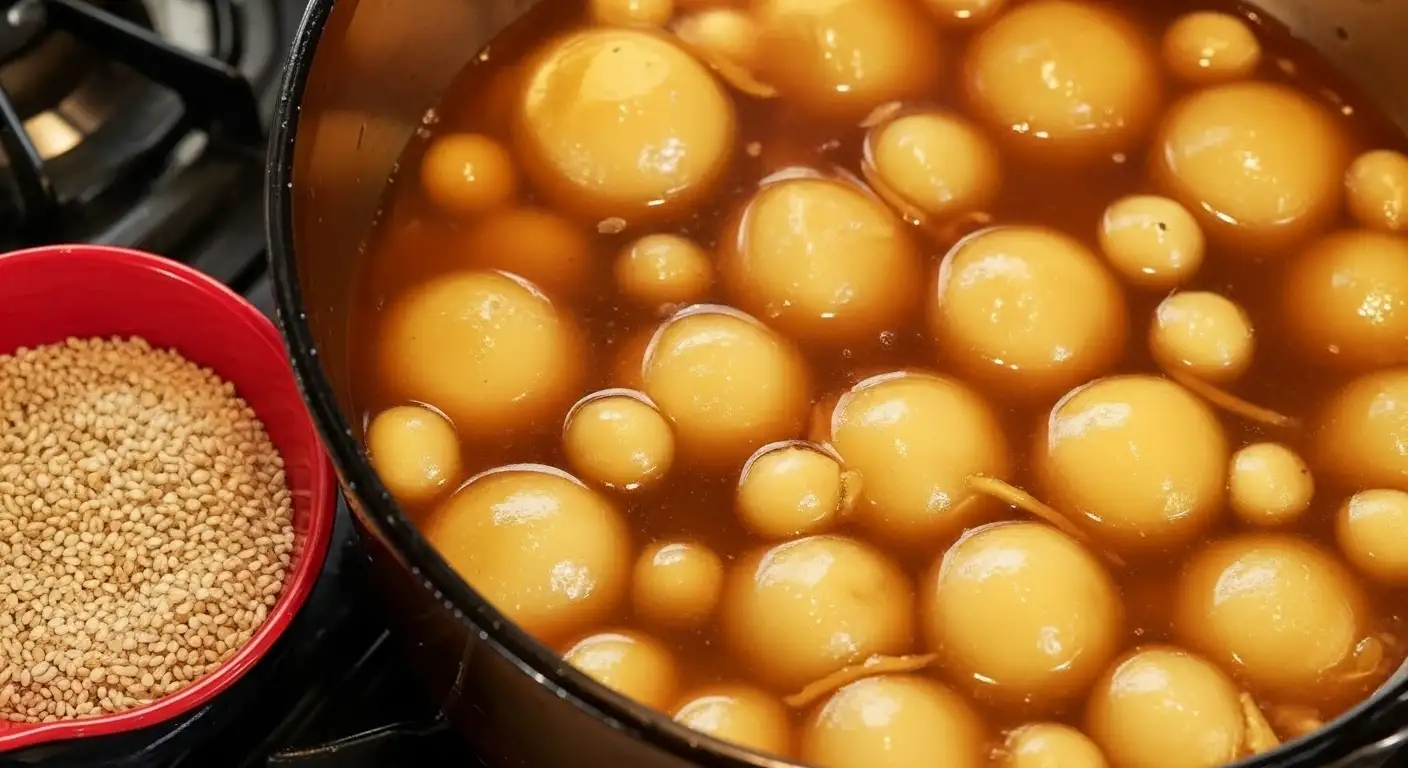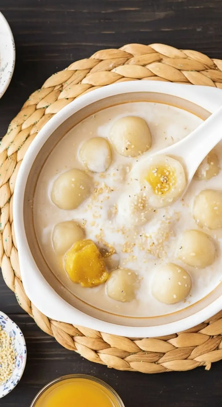 Spoon Eating: Use a spoon to scoop up the entire dessert. Take a bite of the chewy rice ball with its sweet, creamy filling, followed by a spoonful of the warm, gingery syrup to balance the sweetness. The toasted sesame seeds provide a nutty flavor and pleasant crunch.