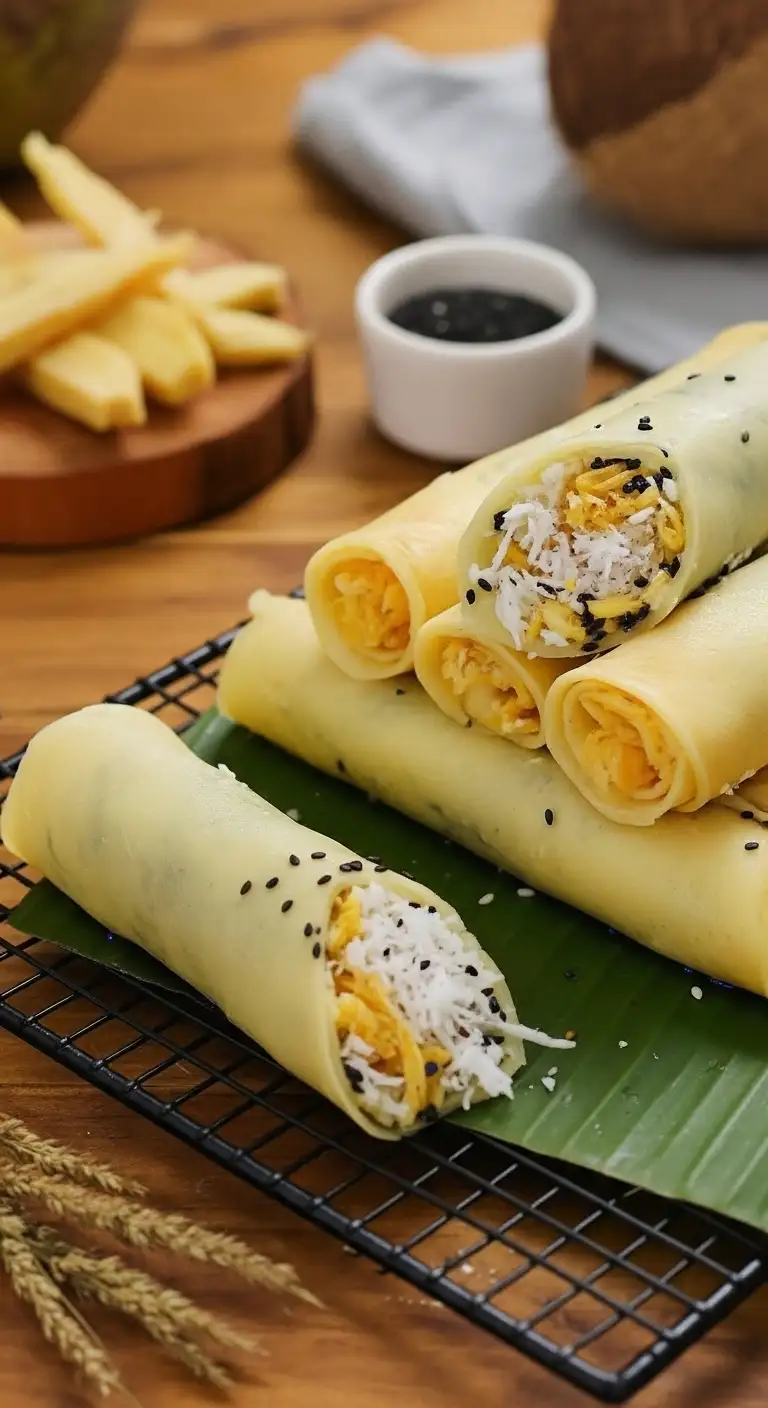 Sweet Bò Bía (Bò Bía Ngọt)Dessert/Childhood Snack (Primarily North Vietnam)Crispy Malt Candy, Shredded Coconut, Black Sesame Seeds.Soft Wheat Flour Crepe (or Rice Paper)Sweet, Creamy, Crunchy, Melting Texture.
