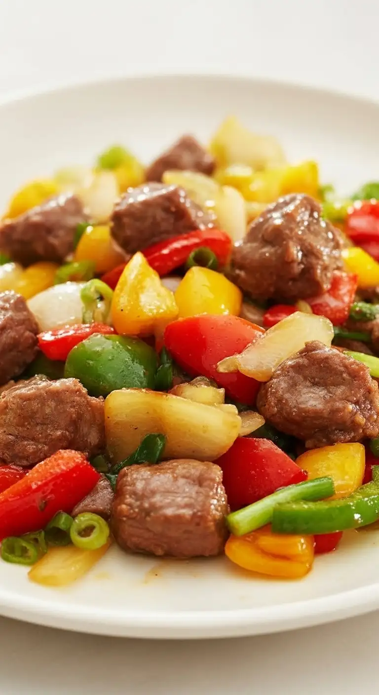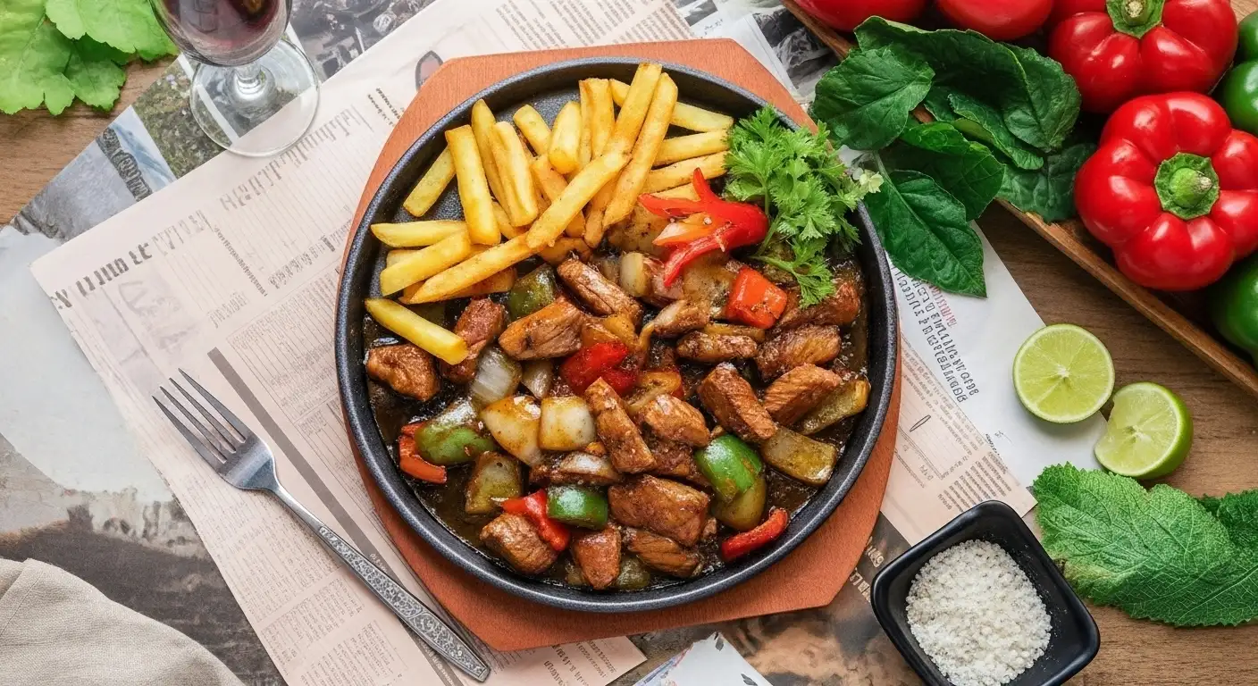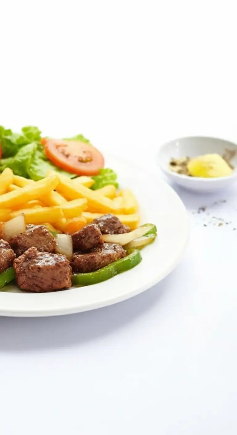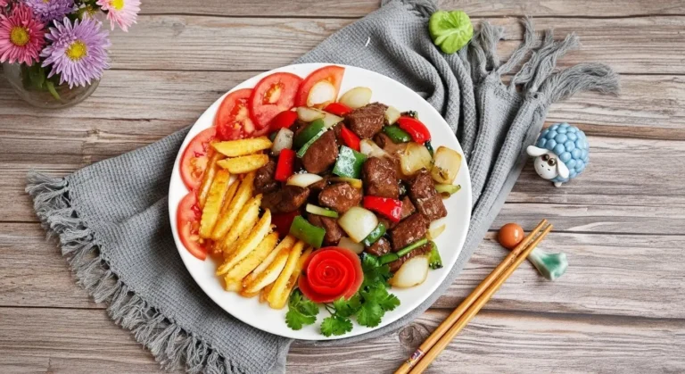 The Cooking Technique (The “Shake”): The cubed beef is seared in a very hot wok with butter and a touch of oil. The continuous “shaking” or tossing ensures the outside of the cubes gets a beautiful, caramelized crust while the inside remains tender and juicy (often cooked to medium-rare). Sliced onions are added near the end to slightly wilt and soak up the pan juices.