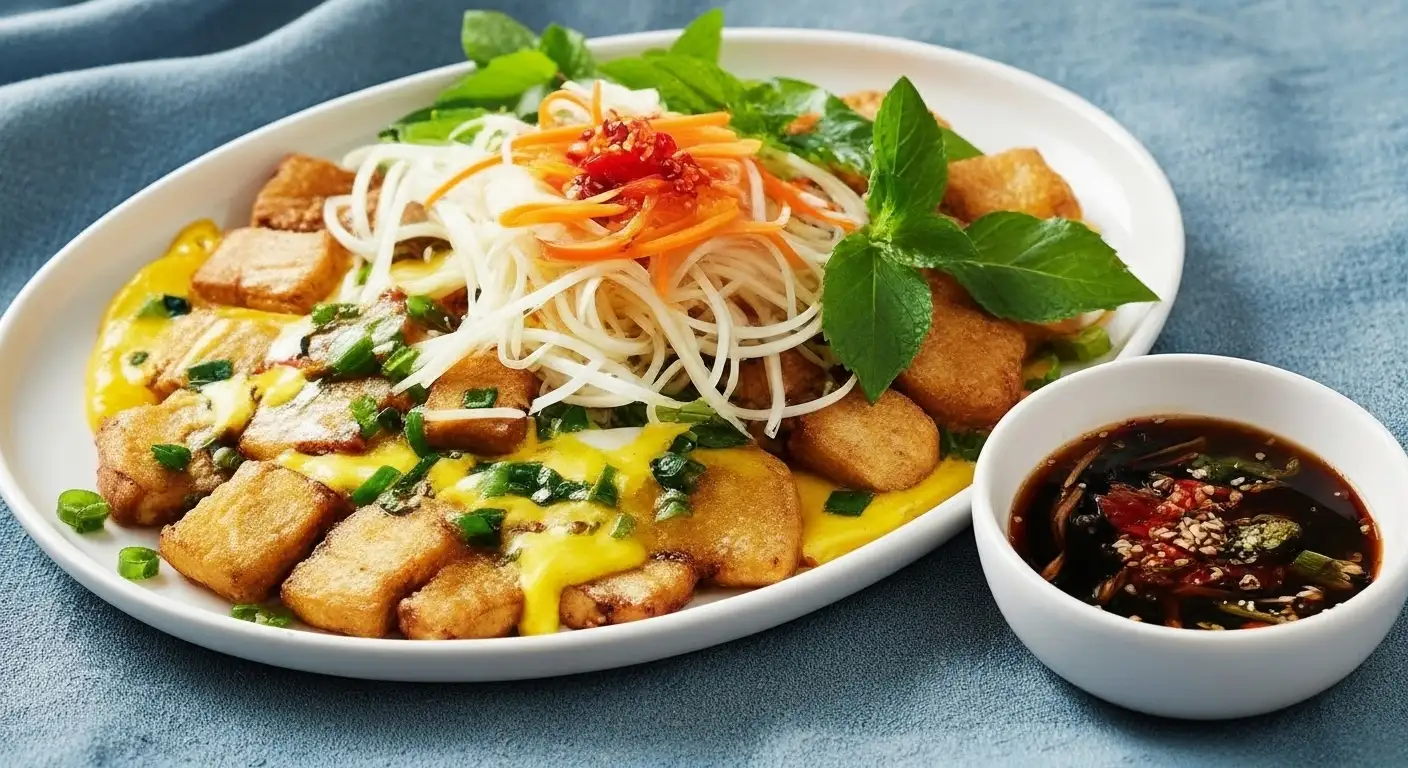The Garnish: A serving is typically topped with crunchy pickled vegetables (Đồ Chua—shredded carrots and daikon) or fresh, shredded green papaya, providing a refreshing counterpoint to the oiliness of the fried elements.
