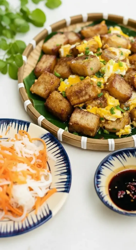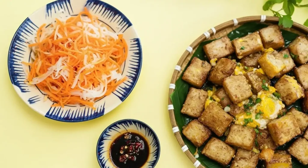 The Dipping Sauce: The soul of the Vietnamese version is a special, sweet, tangy, and slightly spicy soy-based sauce. It is usually a blend of soy sauce, sugar, vinegar, and fresh chili, balancing the richness of the fried cake and egg.