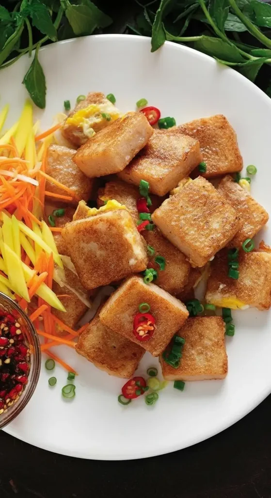 The Egg & Topping: The cubes are then pushed to one side of the pan, and a beaten egg (often duck or chicken) is poured over them, binding the cakes together like a savory omelet. It is topped with chopped green onions (hành lá) right before serving.