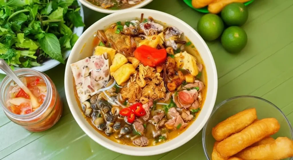 4. Mix and Enjoy: Mix the noodles, riêu, tofu, and other toppings with the now-customized broth. The goal is to enjoy the complex balance of sour, savory, and spicy flavors alongside the varied textures (soft riêu, chewy noodles, crunchy vegetables).