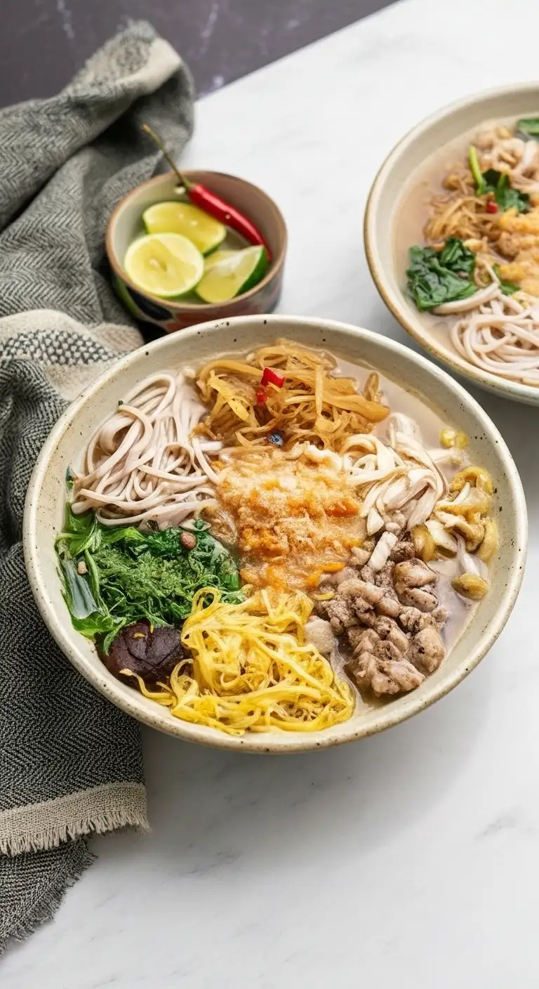 Classic Bún Thang Hà Nội (Hanoi): This is the gold standard. It emphasizes a light, clear broth and the visual precision of the main four toppings (chicken, egg, chả lụa, shrimp floss). Historically, a drop of rare Ca Cuống (giant water beetle essence) was added for a unique floral aroma, though this is rarely done today.