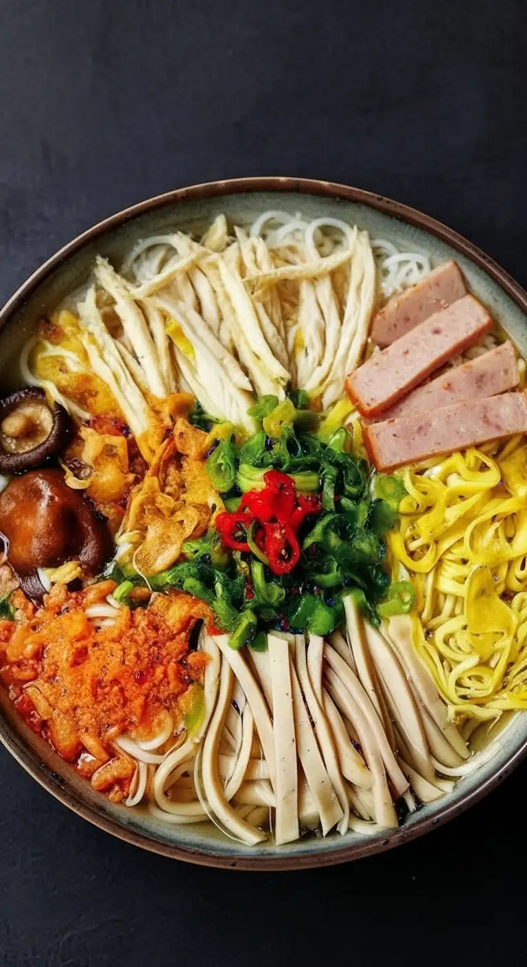 The Meticulous Toppings: The defining characteristic of Bún Thang is its presentation, featuring nearly 20 components, each prepared separately and laid out in colorful, fine ribbons across the bowl like a work of art: