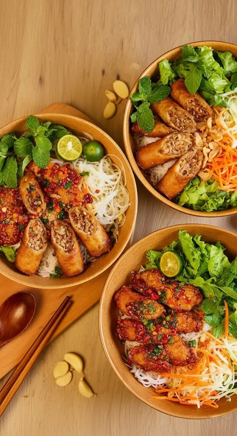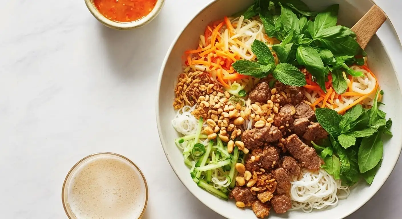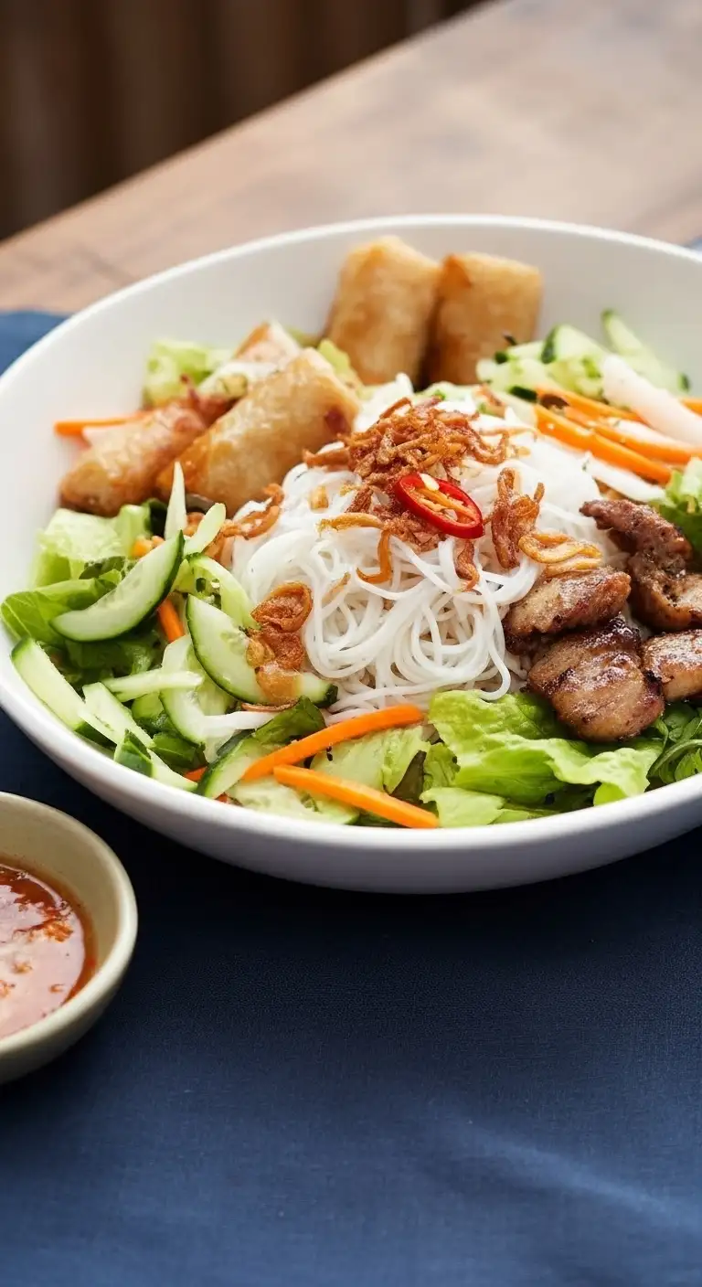 Bún Thịt Nướng Chả Giò (pronounced “Boon Tit Noong Cha Yaw”) is one of the most beloved and refreshing noodle dishes in Vietnamese cuisine, particularly associated with the Southern regions. It’s essentially a harmonious cold vermicelli salad bowl that perfectly balances sweet, savory, fresh, and crispy elements.
