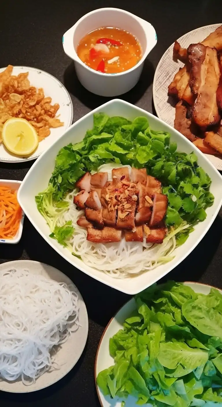 | Serving Style | All components (noodles, meat, herbs, spring rolls) are combined in one large bowl and then dressed with Nước Chấm. | Noodles and herbs are served on a separate plate. The grilled meat and the Nước Chấm (often with pickled green papaya) are served in a hot, separate dipping bowl. The diner dips the noodles and meat into the sauce bite-by-bite. | Similar to the Southern style (everything mixed), but the Nước Chấm might be locally altered with stronger, funkier fermented ingredients. |