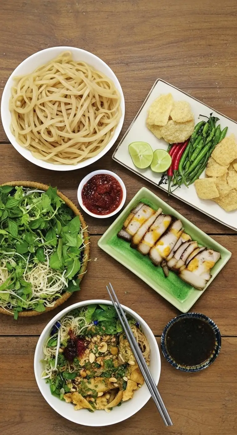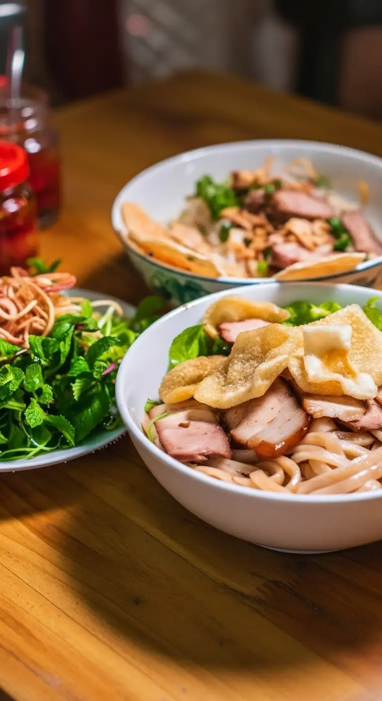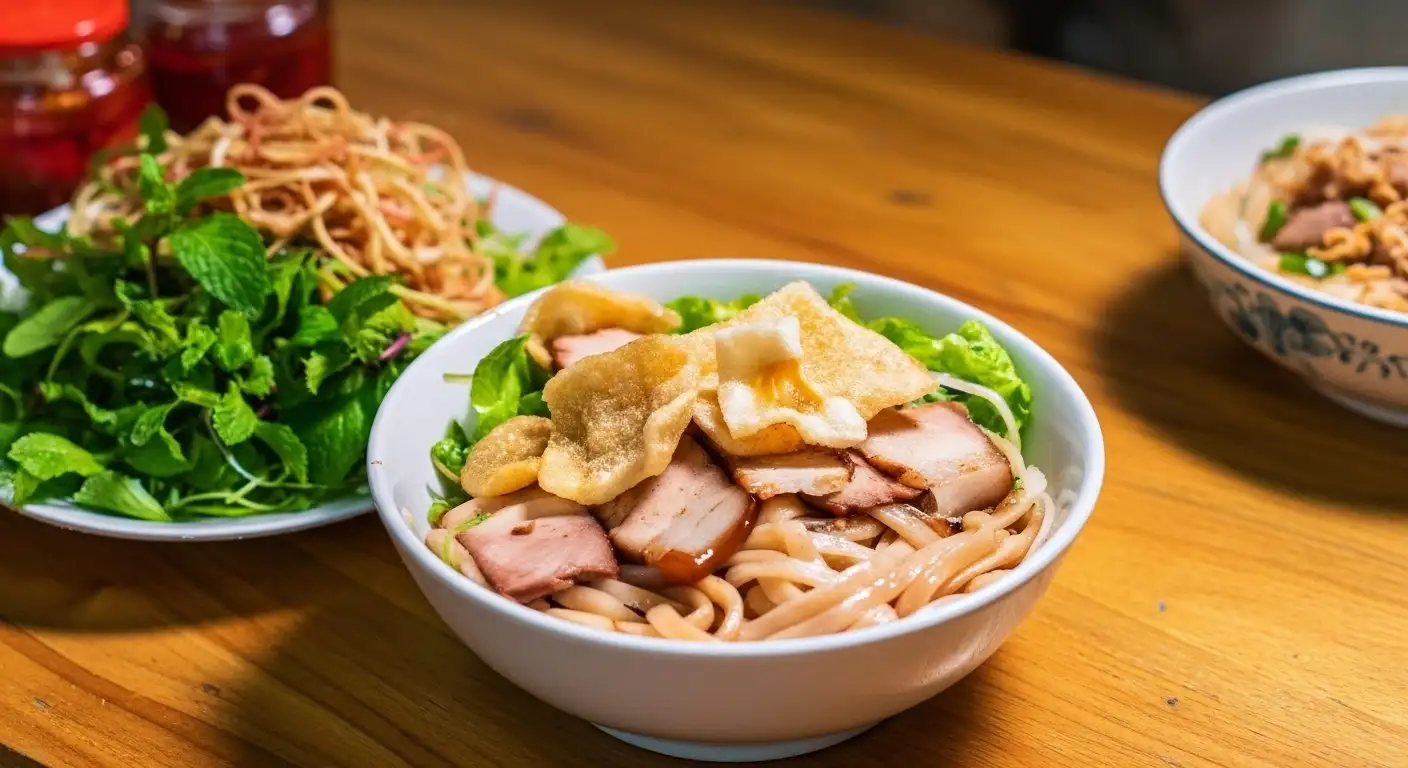 Preparation: The bowl is typically layered with fresh herbs and bean sprouts at the bottom, topped with the Cao Lầu noodles, char siu pork, and a small ladle of the rich sauce, finished with crispy rice paper.