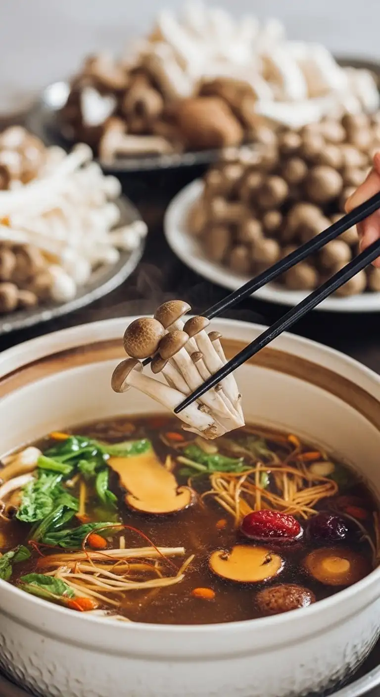A very popular version, particularly in the cooler North. The broth is a fragrant chicken stock, and the dish includes pieces of chicken (often high-quality or black chicken) to be cooked alongside the mushrooms. This combination is highly valued for its purported health benefits and nutritional value.
