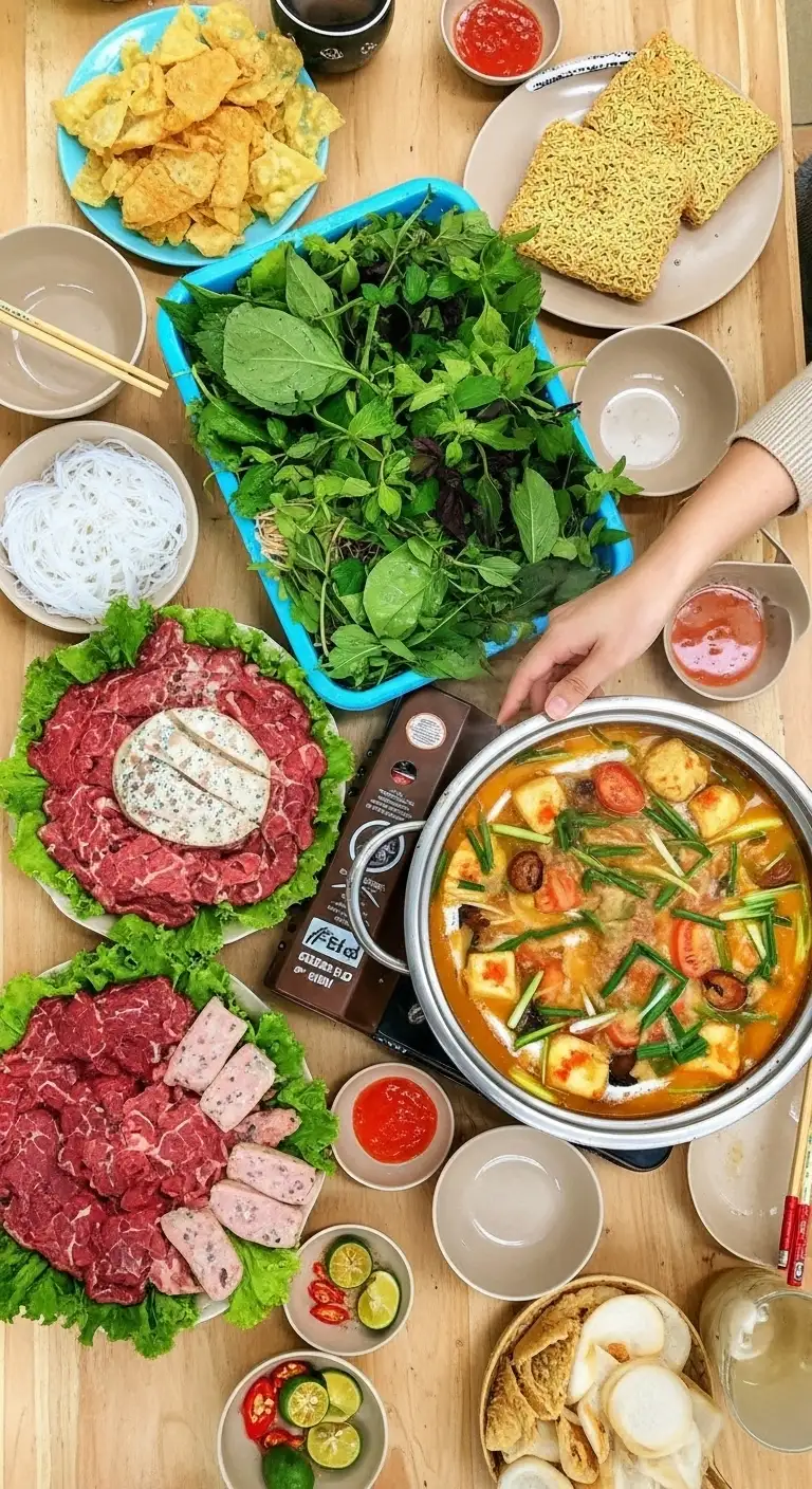 | South (Saigon, Mekong Delta) | Sweeter and Richer. Reflects the Southern preference for a generous sweetness and heartier flavors. | Lẩu Riêu Cua Thịt Bò: The broth is often noticeably sweeter (more sugar) and may be richer. More common to see a variety of meats and sometimes seafood added. | Vegetables tend to be more varied and abundant. The flavor is generally more accessible to a mass audience due to the pronounced sweetness. |