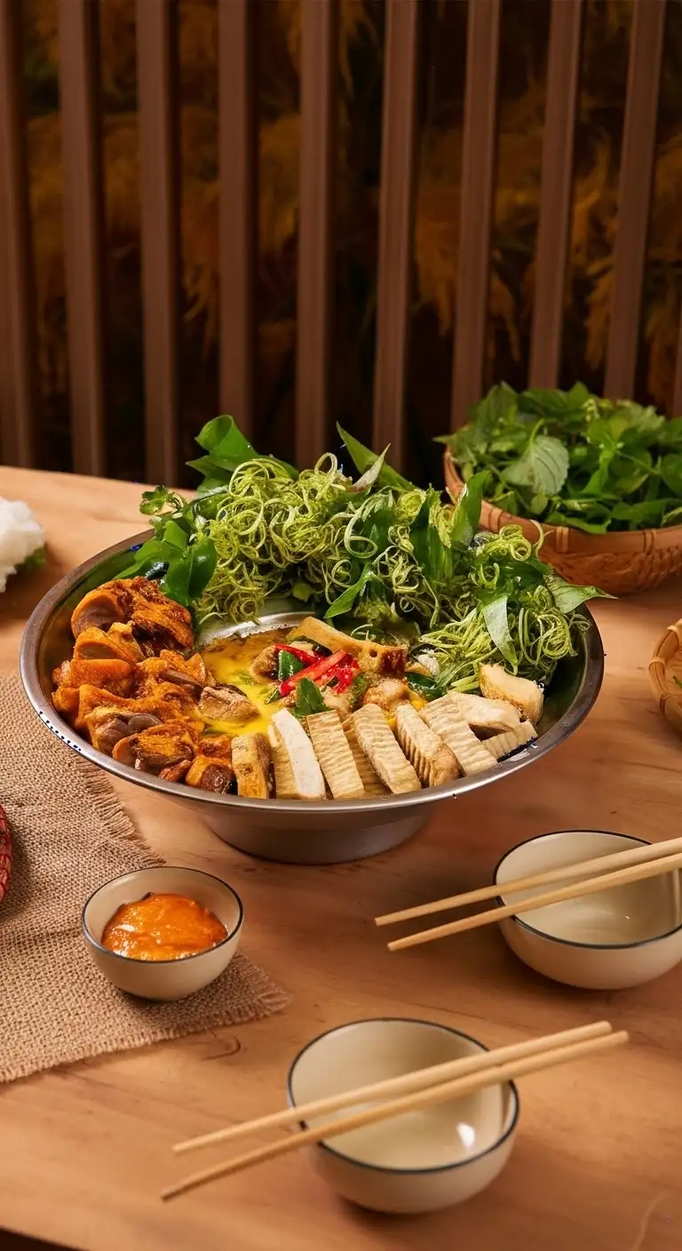 | South (Saigon/Mekong Delta) | Sweet, Rich, and Creamy. Flavors are richer and usually feature a distinct sweetness, characteristic of Southern cuisine. | Lẩu Vịt Nấu Chao: The creamy, aromatic, and savory fermented bean curd (chao) broth is the most popular, often enriched with coconut water and taro. | Sweetness is prominent; the broth is generally sweeter and uses coconut milk or sugar more liberally than the other regions. |