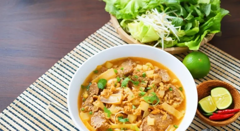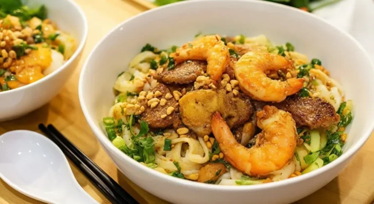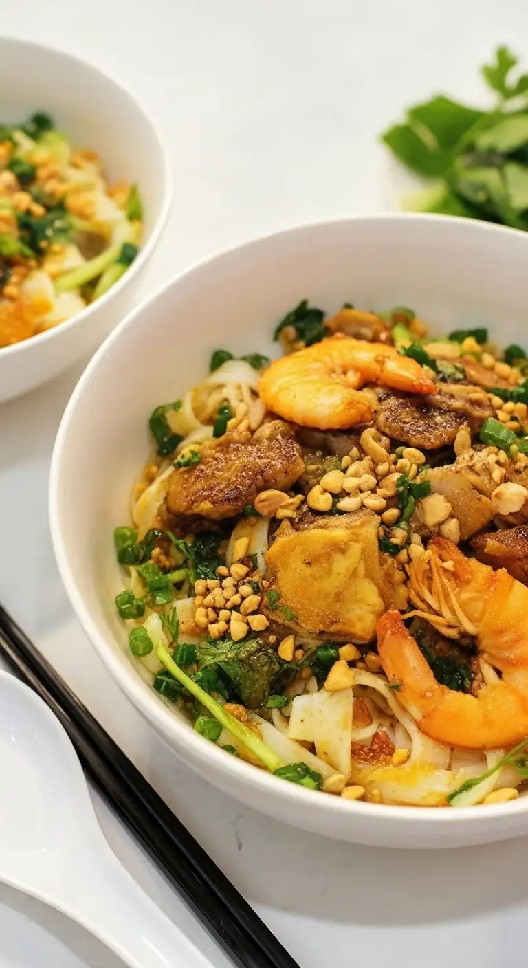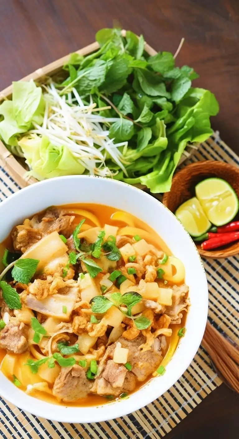 The Noodles: The star of the dish, these are wide, flat rice noodles, often given a signature yellow tint with a touch of turmeric and sometimes coated with peanut oil to keep them from sticking. They are thicker and chewier than phở noodles.