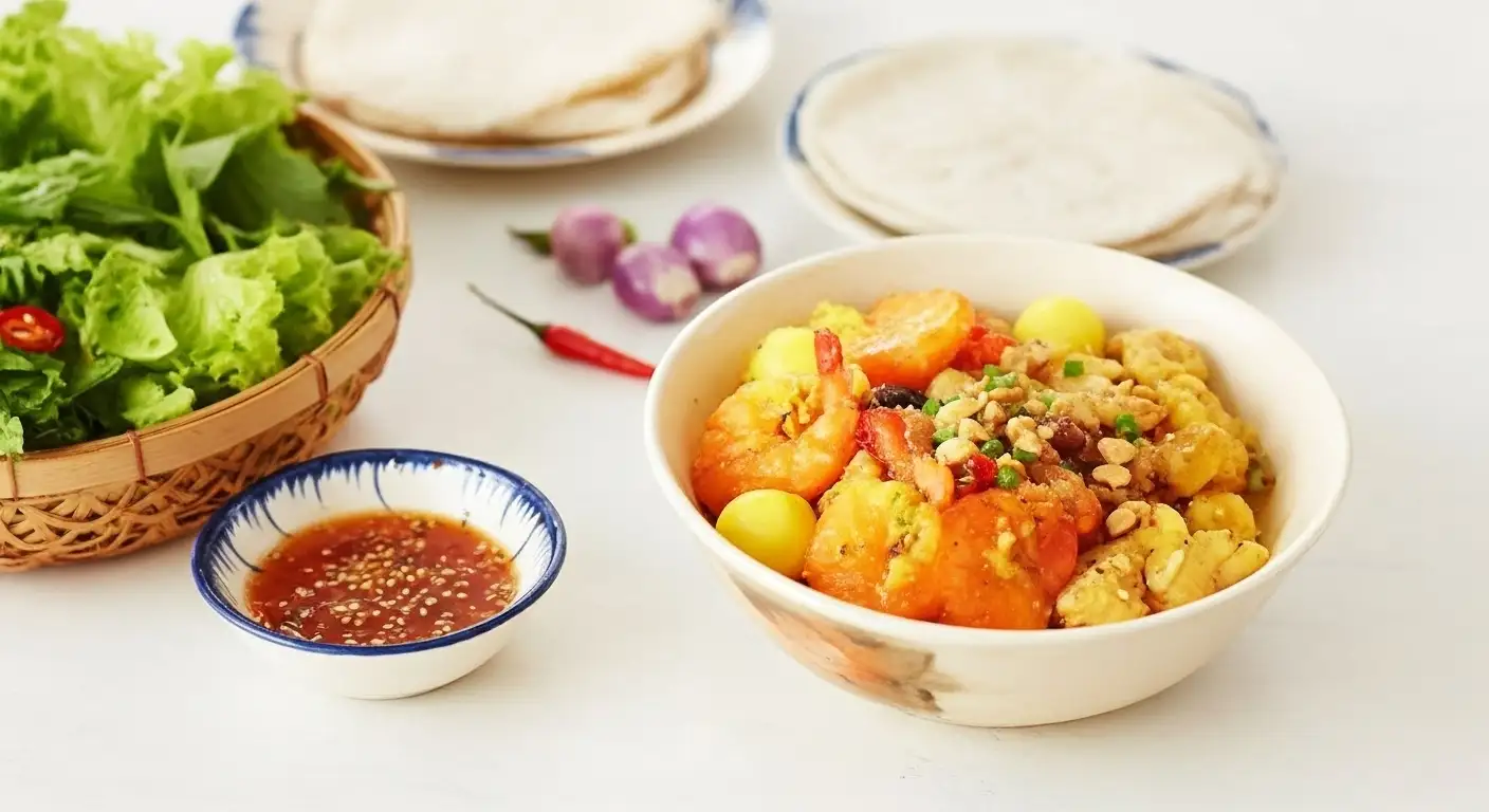 The Broth (Nước Lèo): Unlike other Vietnamese noodle soups that are drowning in broth, Mì Quảng is served with only a small amount of richly flavored, concentrated broth. This broth, simmered from pork bones, shrimp, and sometimes chicken, is thick, intensely savory, and seasoned with fish sauce, shallots, and turmeric. It’s meant to coat the noodles and toppings, not fully submerge them.