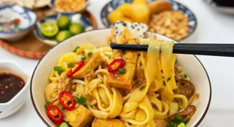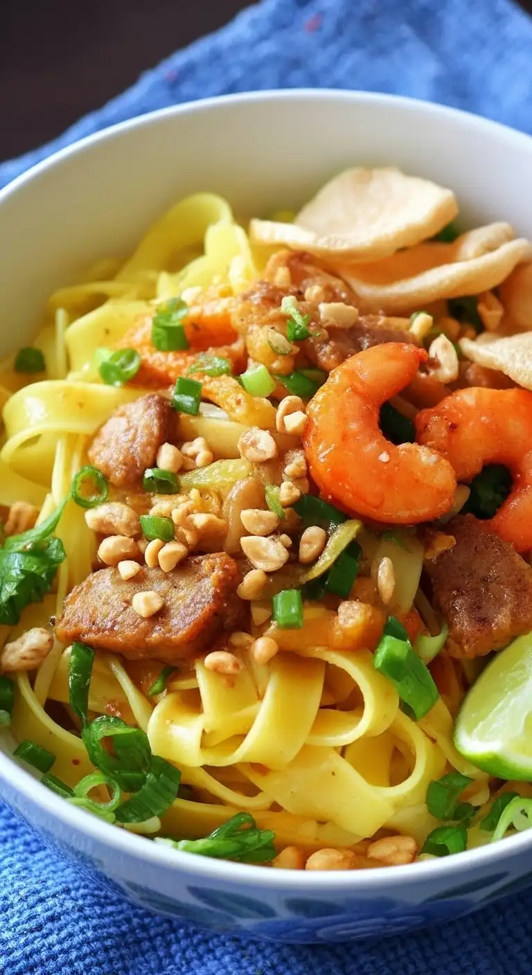 Noodles: Wide, flat, rice-based, often yellow from turmeric.