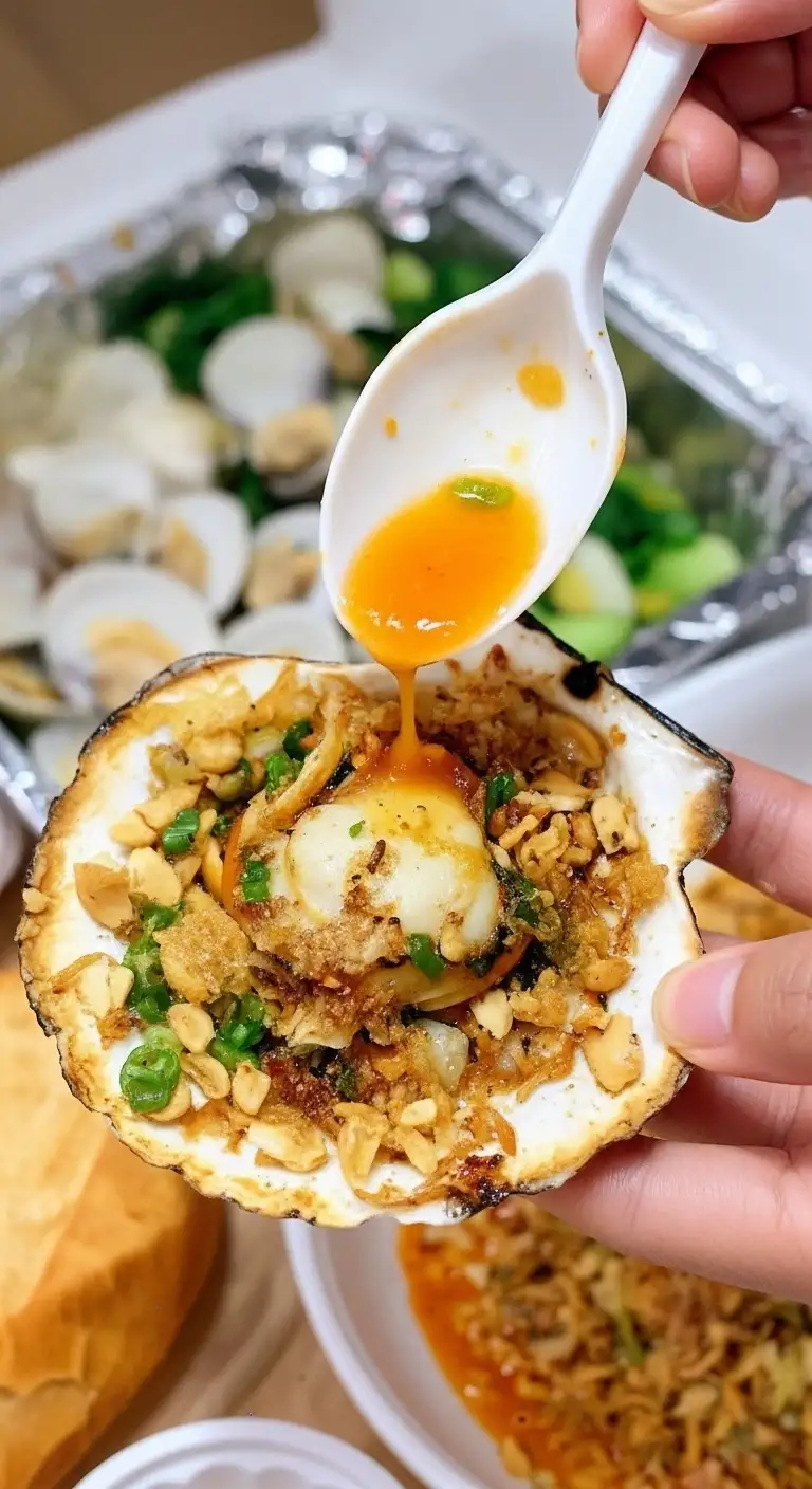 | Sò Điệp Nướng Mỡ Hành | Scallops (or other large shellfish) grilled, topped with scallion oil and peanuts. | Oily, nutty, savory, and aromatic from the fresh scallions. |