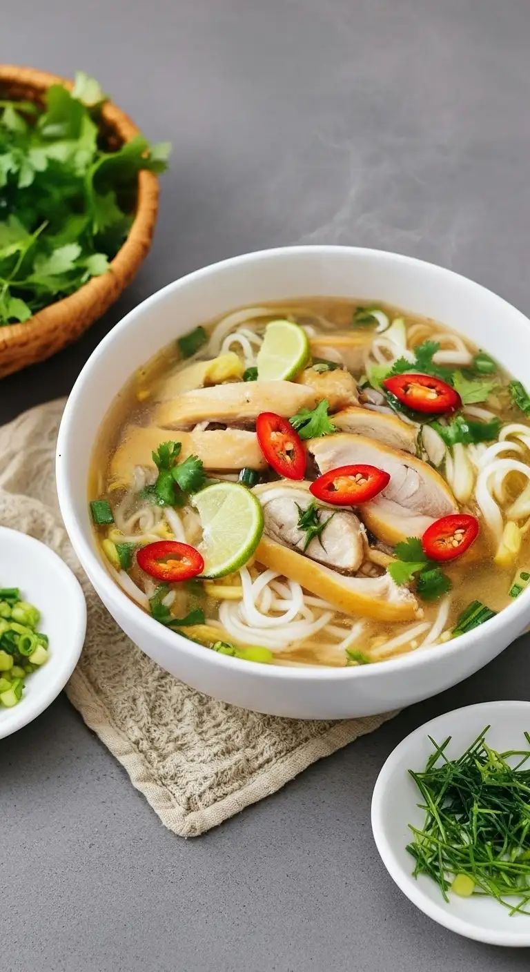 Phở GàChicken PhởMade with a milder, clearer chicken broth and shredded or sliced chicken.