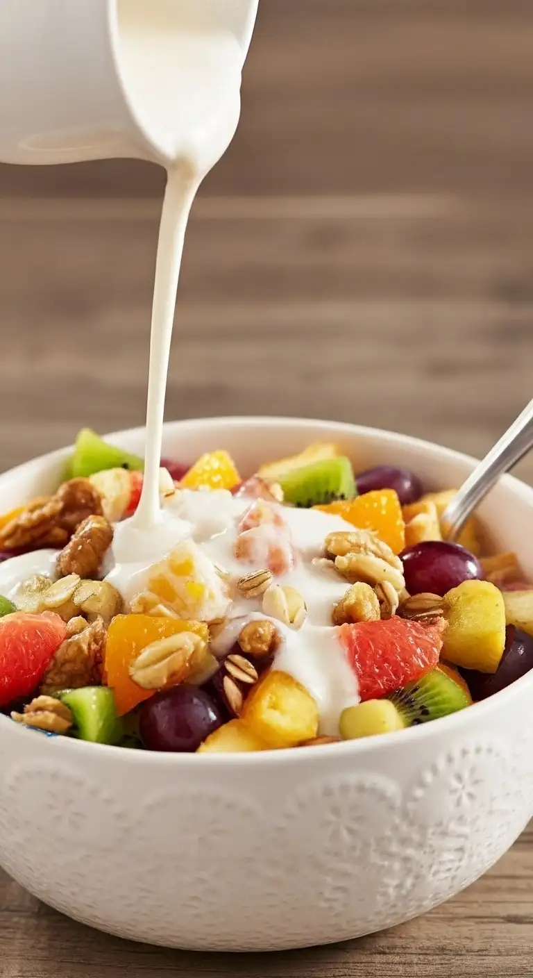Trái Cây Dầm Sữa Dừa (With Coconut Milk): A richer variation where the condensed milk is combined with thick coconut milk or coconut cream, giving the dessert a more pronounced tropical richness.