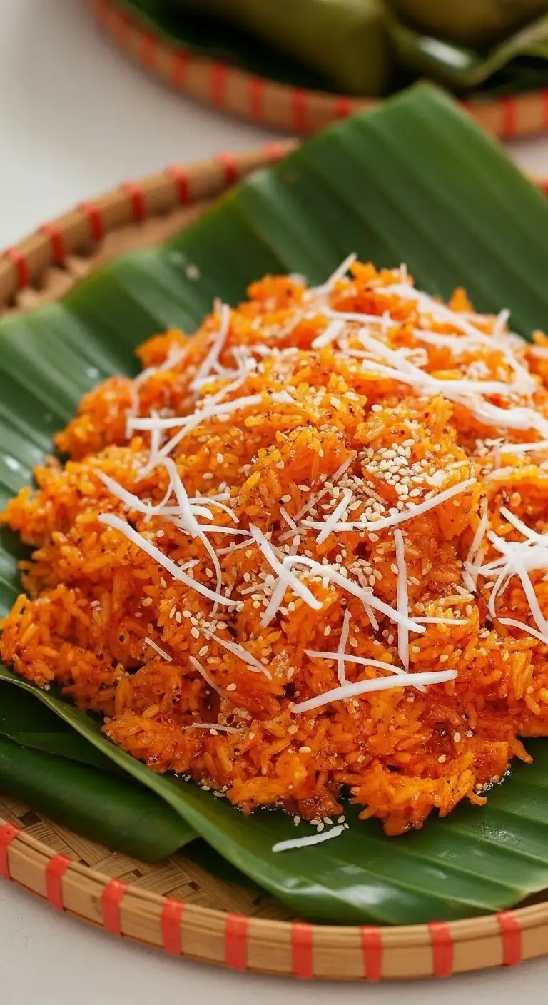 • Xôi Gấc (Red Sticky Rice): The most ceremonial Xôi. The rice is mixed with the pulp of the gấc (baby jackfruit) fruit, giving it a stunning, naturally vibrant red-orange color—a symbol of good luck and happiness. It is lightly sweetened and often served at weddings and Tết.